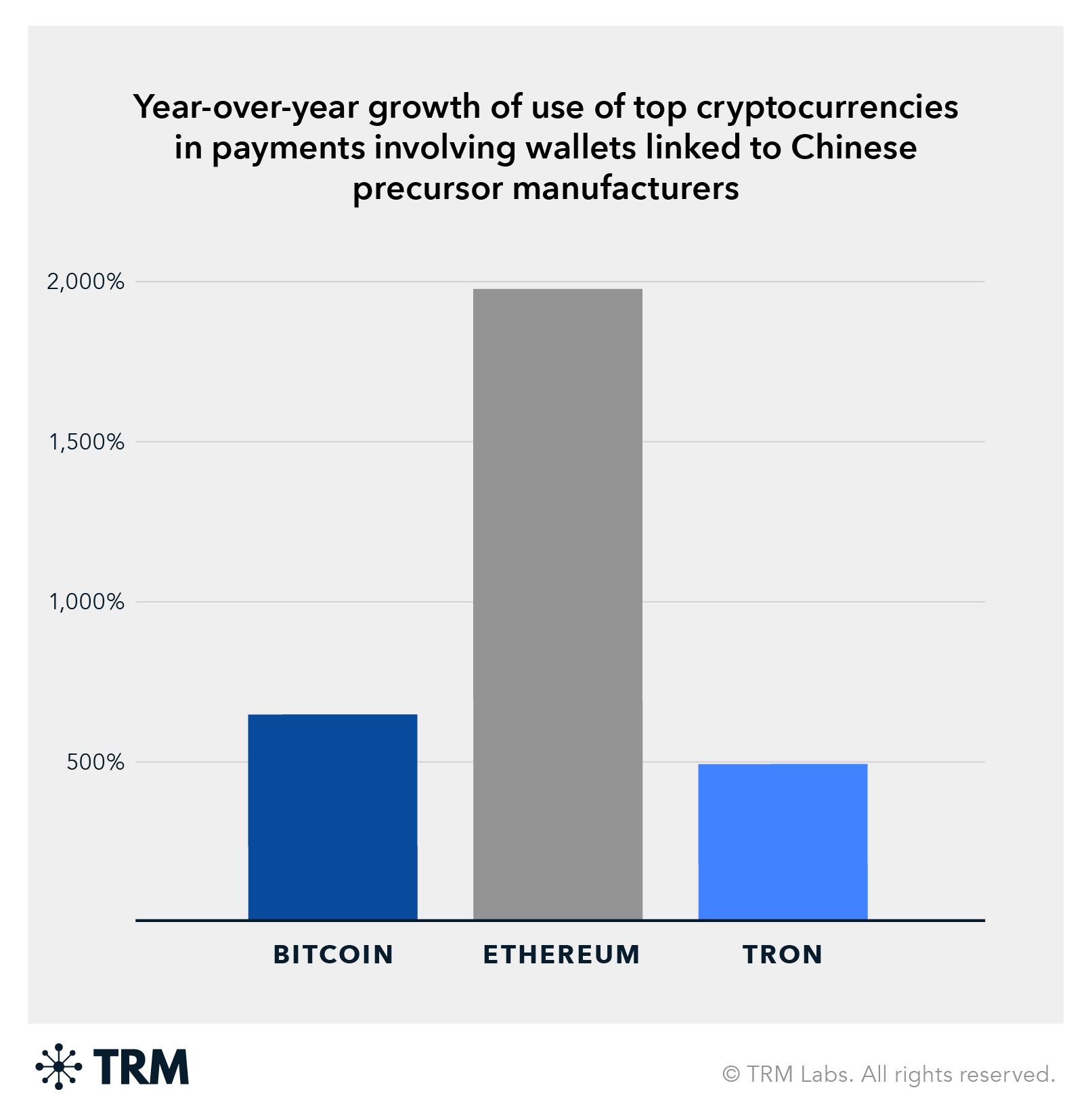 TRM Labs research indicates that Chinese drug precursor manufacturers (key suppliers of fentanyl ingredients) heavily utilize cryptocurrency. Nearly two-thirds of fentanyl precursor sellers studied by TRM advertise to markets including Canada. In 2023, these Chinese suppliers received over USD 26 million in cryptocurrency payments — a 600% increase from 2022.