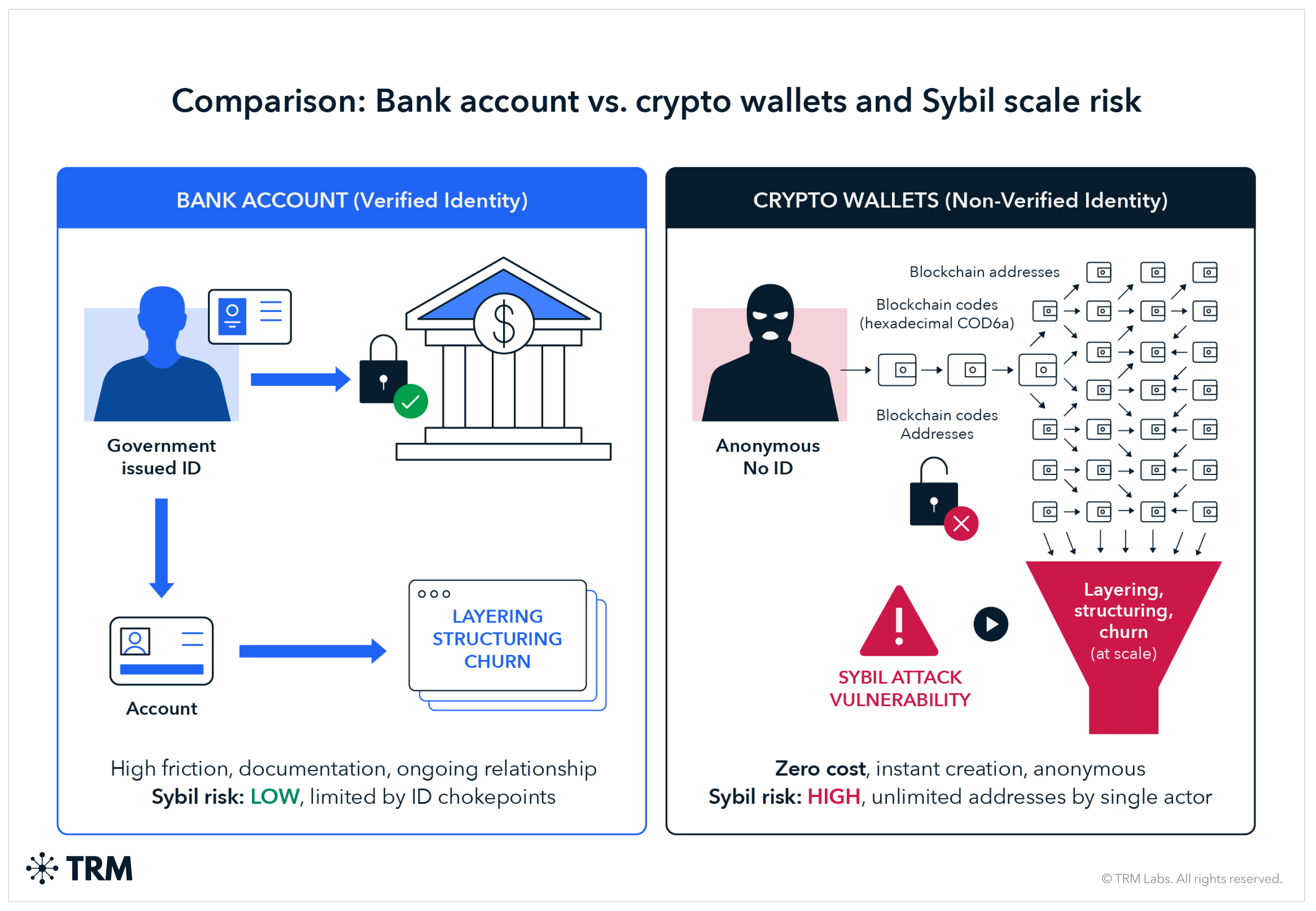 By contrast, opening multiple bank accounts requires identity documentation, onboarding friction, and ongoing relationship management — natural chokepoints that limit Sybil attacks.