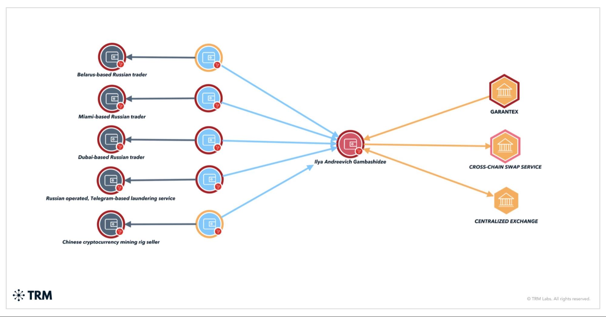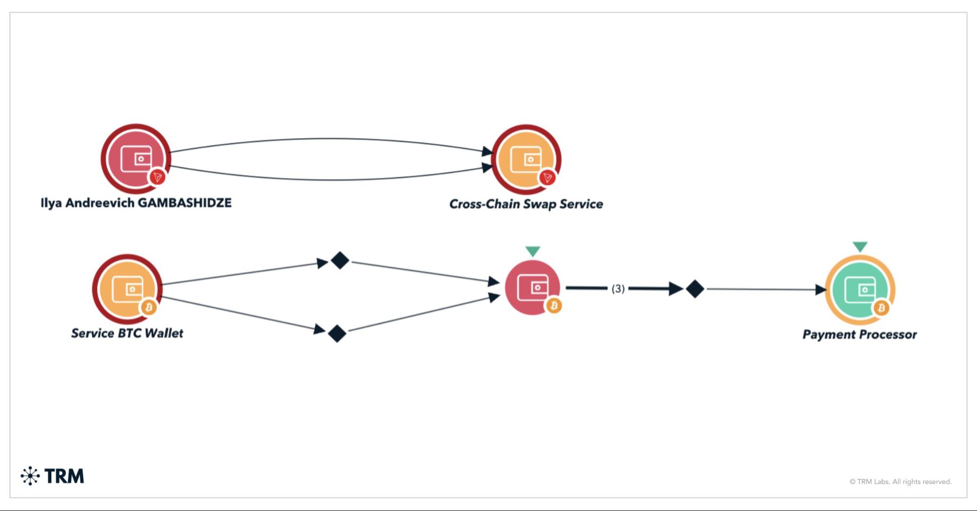 By using BLOCKINT, investigators were able to identify that the first address (TMGLq) was active between April 2022 and March 2024. The vast majority of the funds received by the address came from the sanctioned Russian exchange Garantex. TRM Labs traced several payments through the cross-chain swap service, including one made to a Bitcoin wallet that paid a US-based payment processor — a potential method of paying for internet infrastructure.