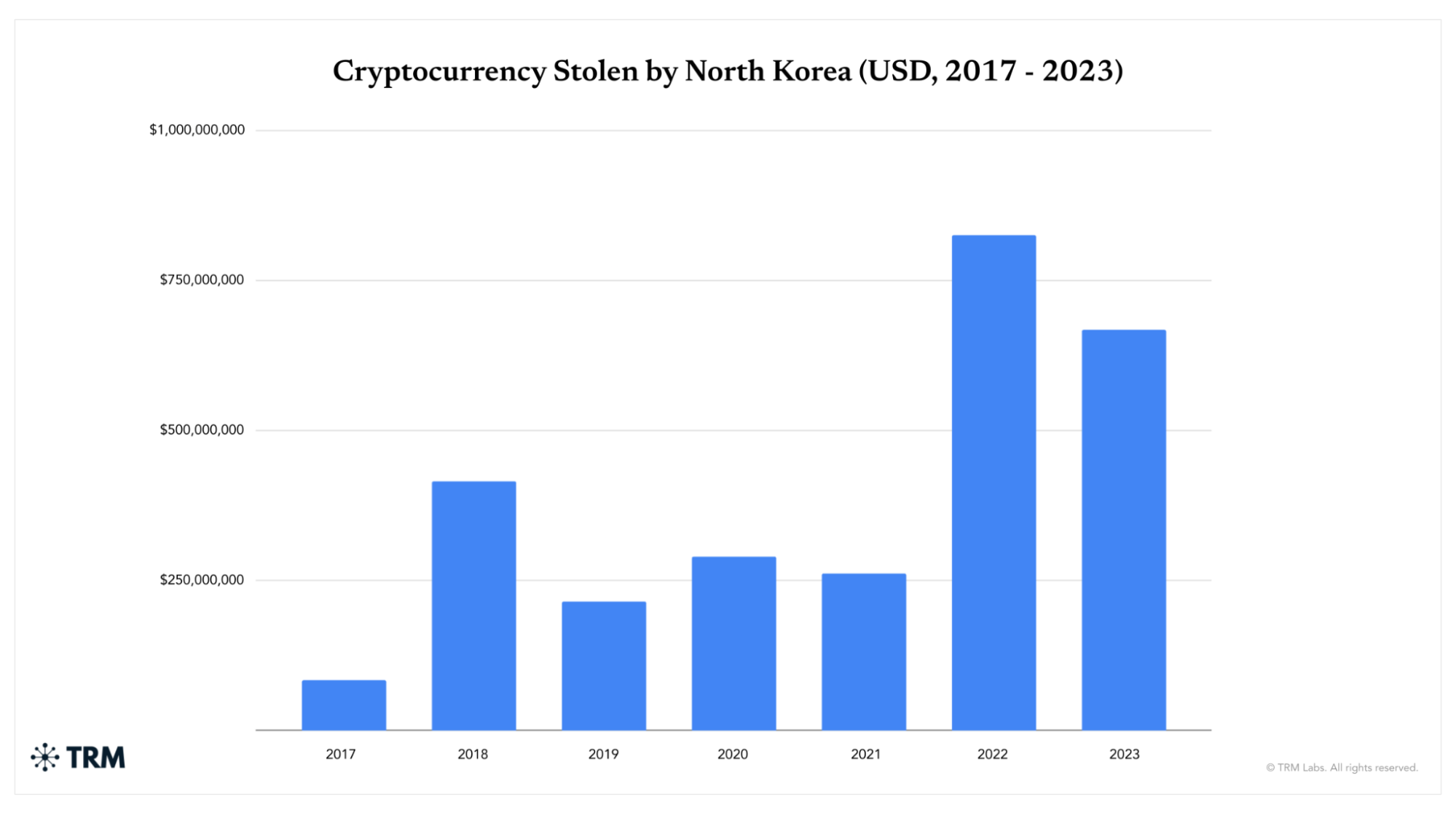 Over the last five years, North Korea has attacked the crypto ecosystem at unprecedented speed and scale. Nearly USD 3 billion worth of cryptocurrency has been lost to Pyongyang-linked threat actors between 2017 and 2023. In 2023, hackers tied to North Korea stole approximately USD 700 million in cryptocurrency, according to research by TRM Labs — over a third of all funds stolen in crypto attacks last year, despite an approximately 20% reduction from the USD 850 million haul in 2022. On average, hacks perpetrated by North Korea in 2023 resulted in ten times more losses than those perpetrated by other actors.