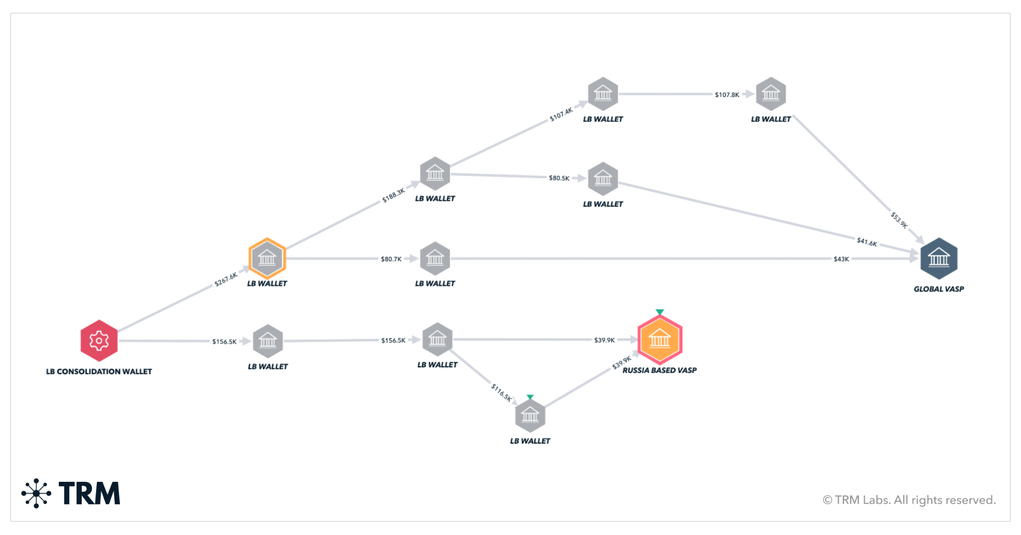 On-chain analysis of LockBit activity highlights the group’s operating structure, where victims’ initial ransom payments undergo a financial split: 80% goes to the LockBit affiliate, and 20% goes to LockBit’s administrators. LockBit operators have subsequently used Wasabi 2.0 to mix funds, and multiple non custodial exchanges and centralized VASPs in the United States and Asia to launder victim funds.