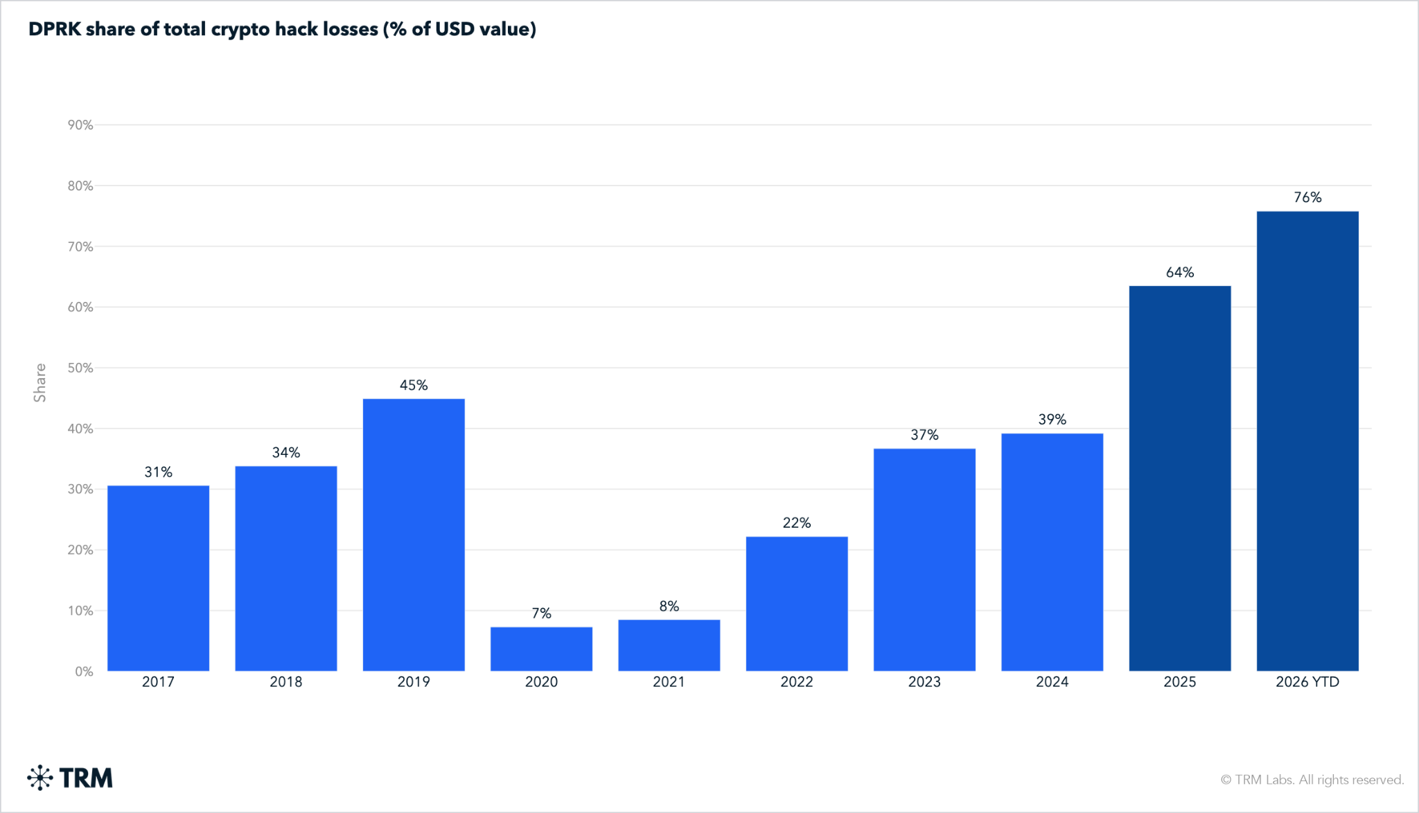North Korea's share of total crypto hack losses has grown from under 10% in 2020 and 2021 to 22% in 2022, 37% in 2023, 39% in 2024, and 64% in 2025. The 2026 figure of 76% through April is the highest sustained share on record.