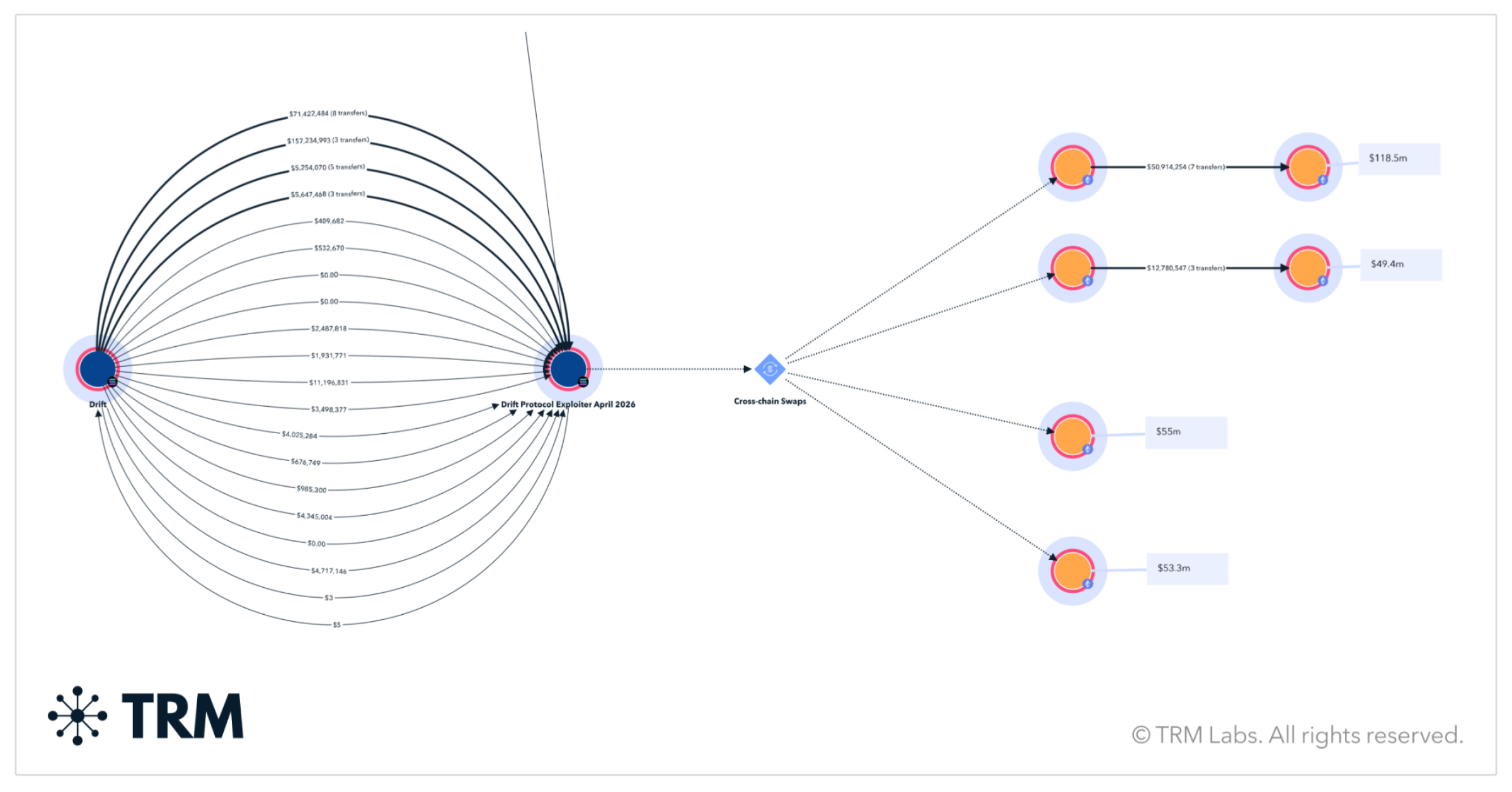 The Drift attack targeted governance infrastructure, not application logic. Protocols using Solana Security Council multisig with durable nonce authorization should treat this as a template attack that will be replicated. Exchanges with Solana DeFi deposit exposure should flag inflows from bridge contracts used in the Drift dispersal — including specific Jupiter and Wormhole routes identified in TRM Transaction Monitoring.