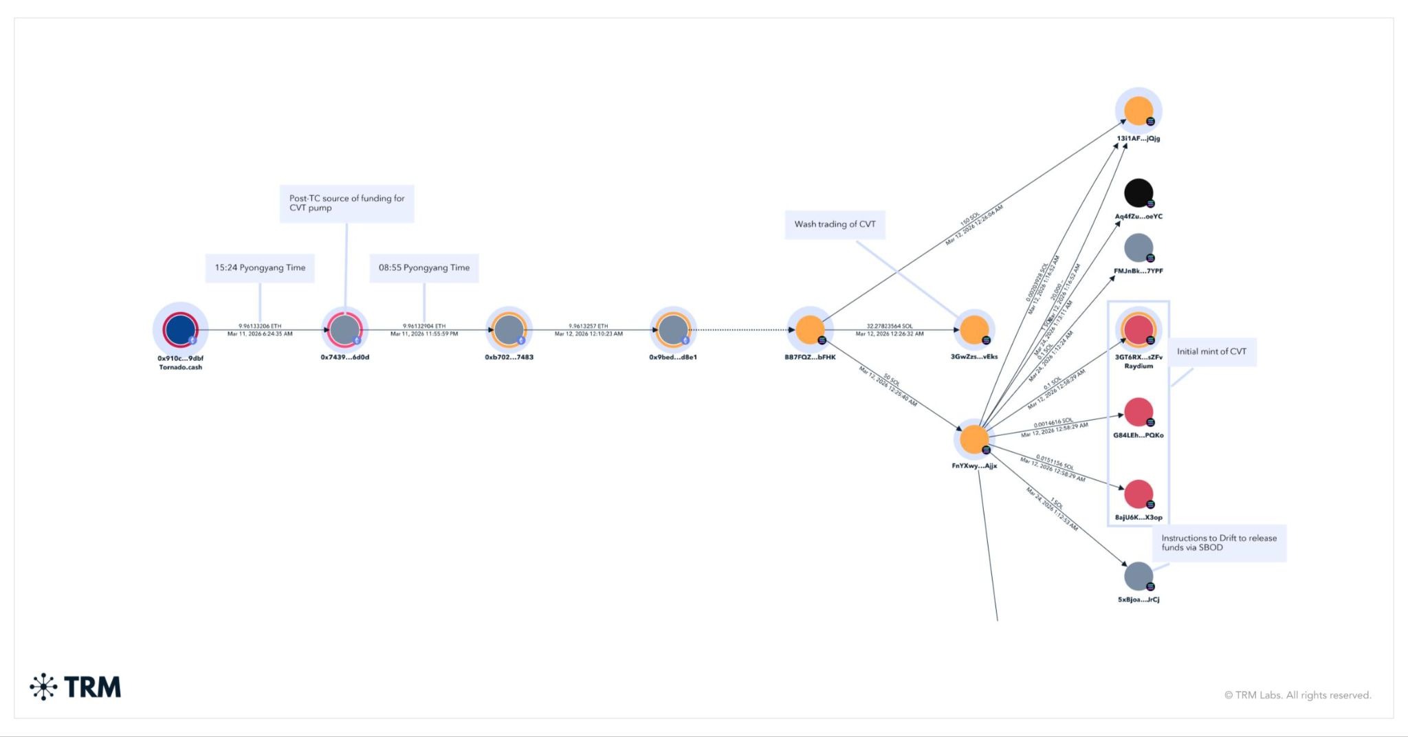 TRM's initial investigation identified several on-chain indicators consistent with North Korean tradecraft, including the use of Tornado Cash for initial staging, the deployment timing of the CarbonVote token at 09:30 Pyongyang time, the cross-chain bridging patterns, and the speed and scale of post-hack laundering — all of which align closely with techniques observed in prior DPRK-attributed hacks including the Bybit exploit of 2025.