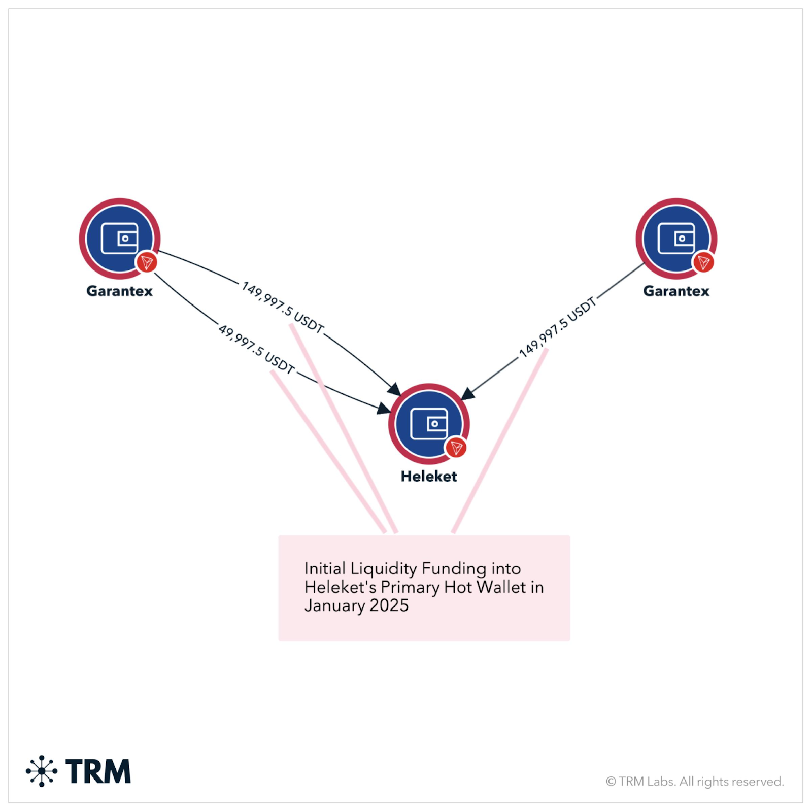 Heleket’s hot wallets received large transfers from Garantex-controlled addresses in January 2025. Similar liquidity relationships were previously observed between Garantex and Cryptomus.