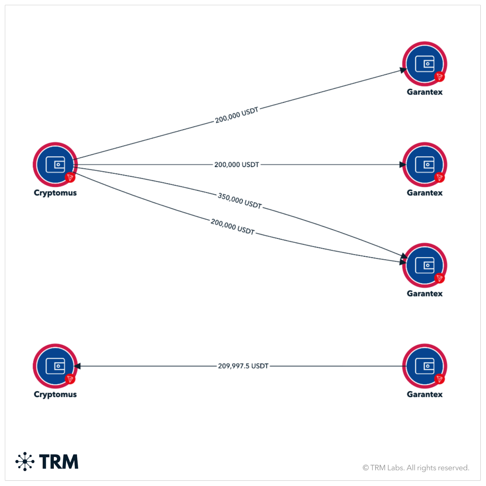 The graph below shows total liquidity flows between Cryptomus and Garantex, including a sample of large, rounded values. These large value transactions between Cryptomus and Garantex is activity equivalent to a liquidity provider relationship often observed in the legitimate virtual asset service provider (VASP) economy, however; a regulated VASP is unlikely to use Garantex as a source.
