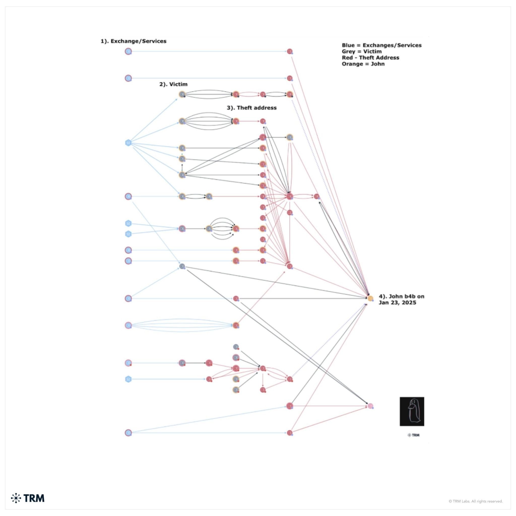 The TRM visualization above, which was shared by ZachXBT on X, illustrates repeated interactions between exchange services, theft addresses, and the final aggregation wallet attributed to “John.”